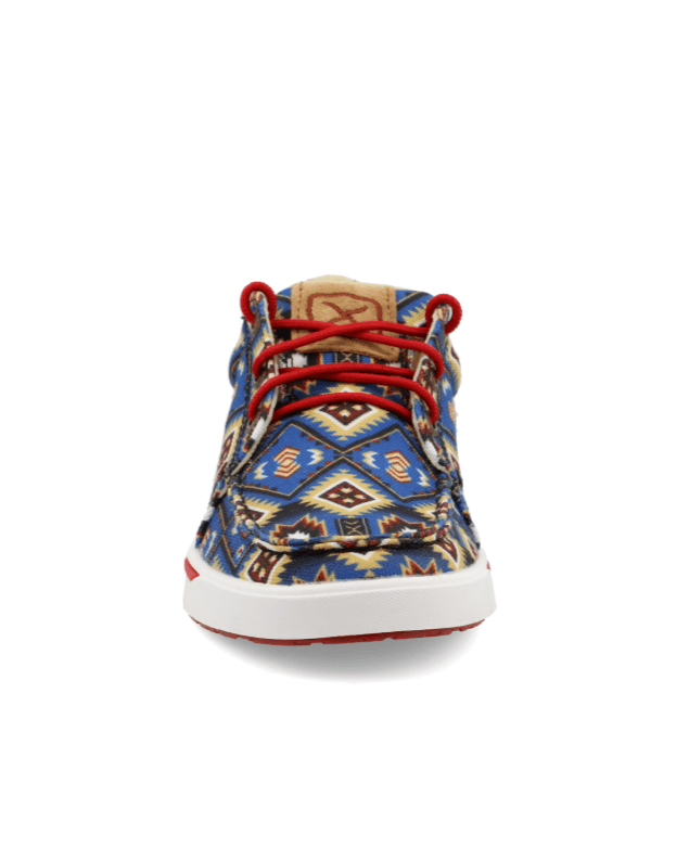 Crafted as part of Twisted X’s renowned Women’s Casual Kicks Collection, this style reimagines a classic silhouette through a modern lens. The upper fabric showcases detailed geometric motifs in saturated shades of blue, crimson, tan, and black. Red nylon laces offer a sharp contrast, while elastic gore panels ensure they slip on with ease—even without laces.