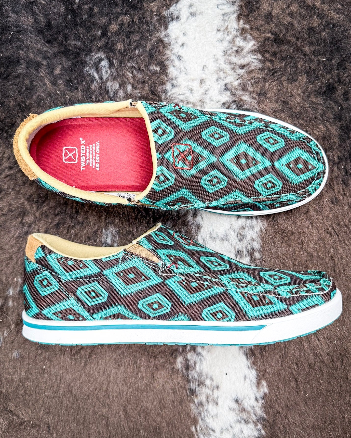 Easygoing style, bold pattern, and comfort that doesn’t quit—meet the Desert Prism. These Twisted X Slip-On Kicks take everything you love about a casual sneaker and give it a fresh, western-inspired twist. With a striking brown and turquoise geometric pattern, this pair brings effortless personality to your everyday look. From coffee runs to concert nights, these kicks are ready to tag along wherever the day takes you.