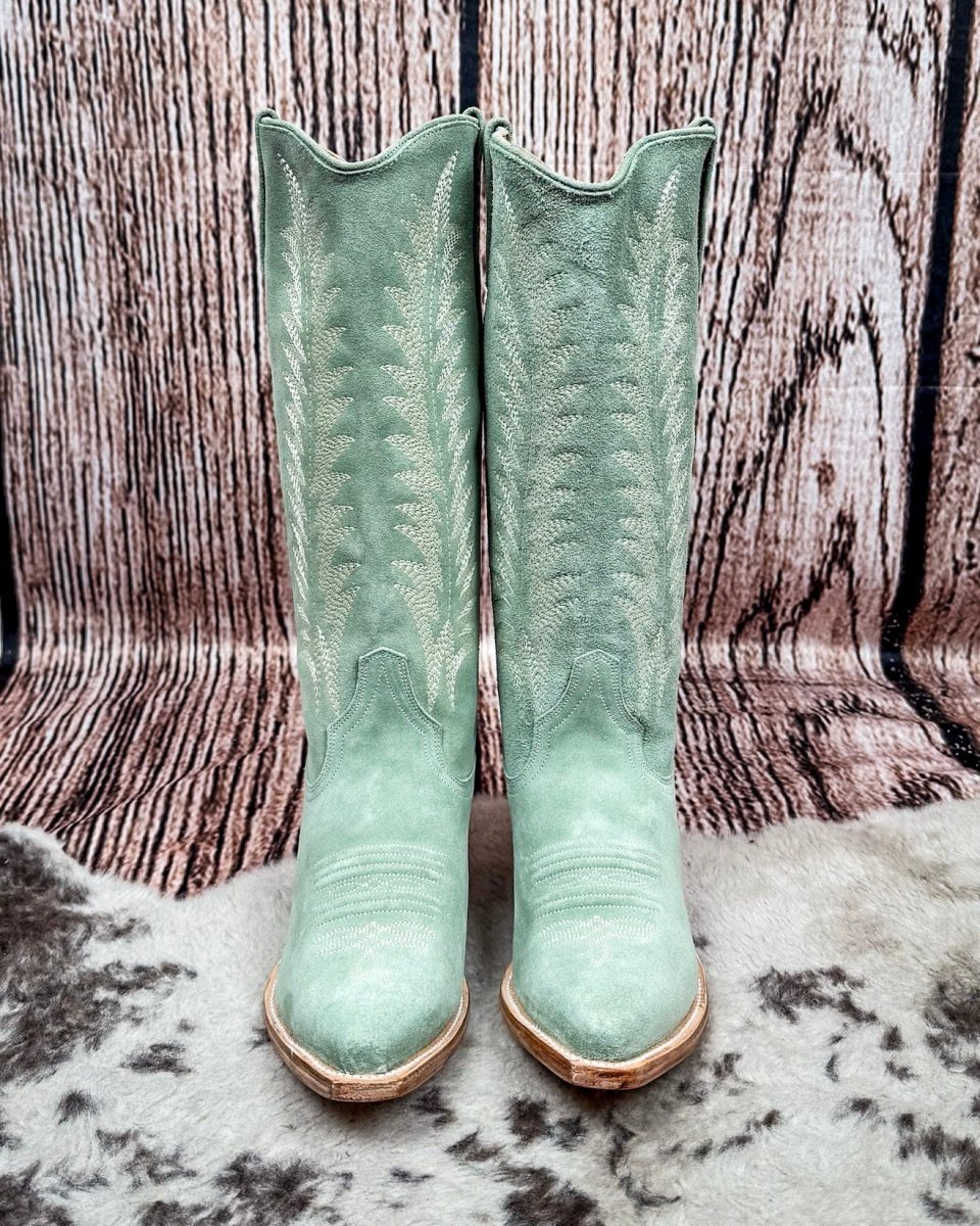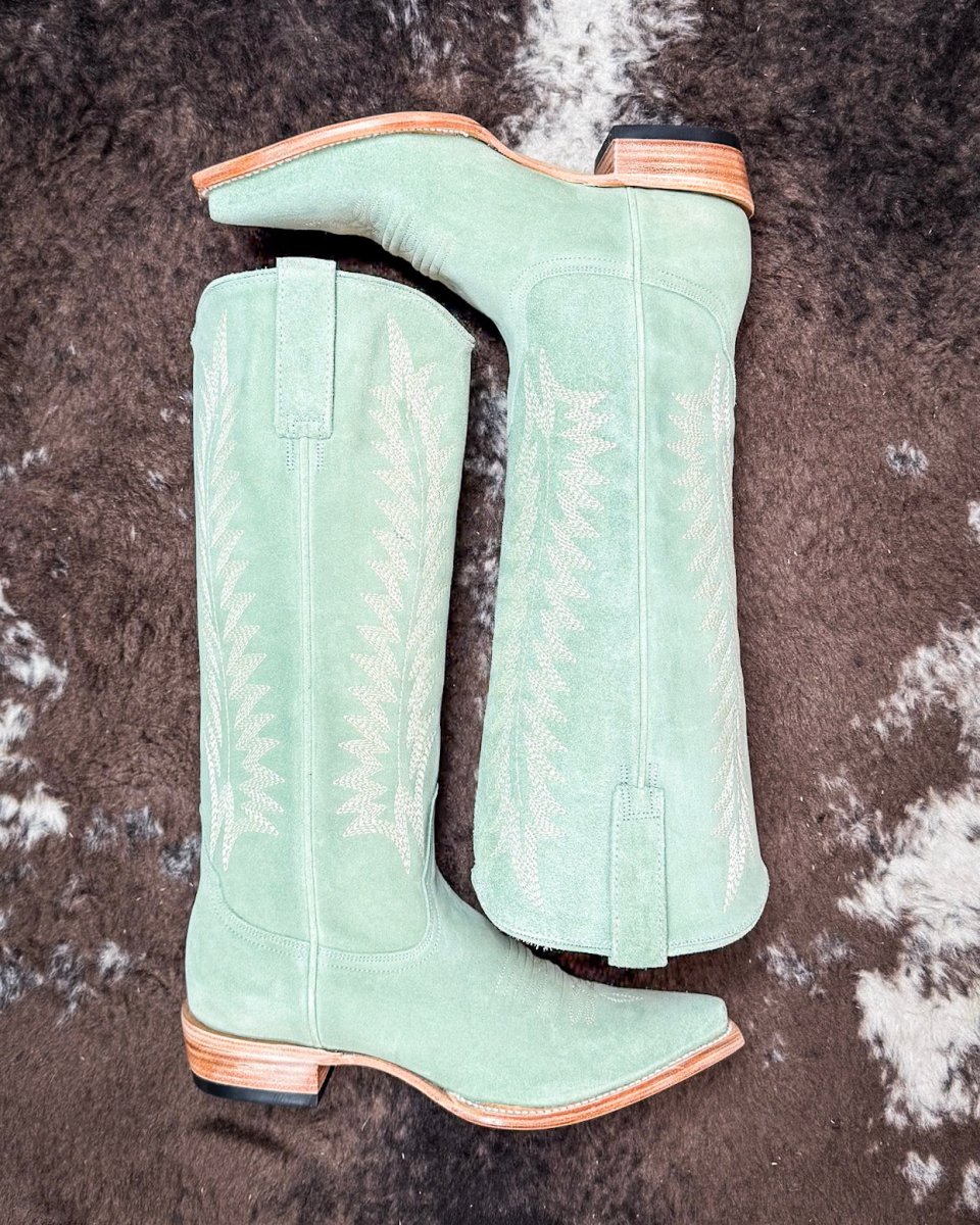 The Emme Vintage Suede Boot in Aqua by Stetson brings a fresh twist to a classic silhouette. Handmade with premium aqua suede and detailed with unique vintage-style embroidery, these tall beauties feature a snip toe, stacked heel, and a buttery leather lining that molds to your foot with every step. From the lemonwood pegs to the cushioned leather insole, every stitch speaks to Stetson’s signature quality. With a 15" shaft and just the right amount of flair, Emme is a statement boot that’s still rooted in tradition.