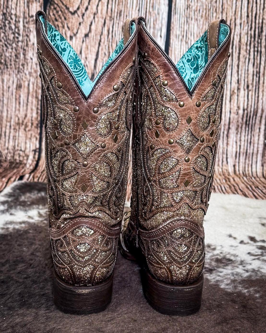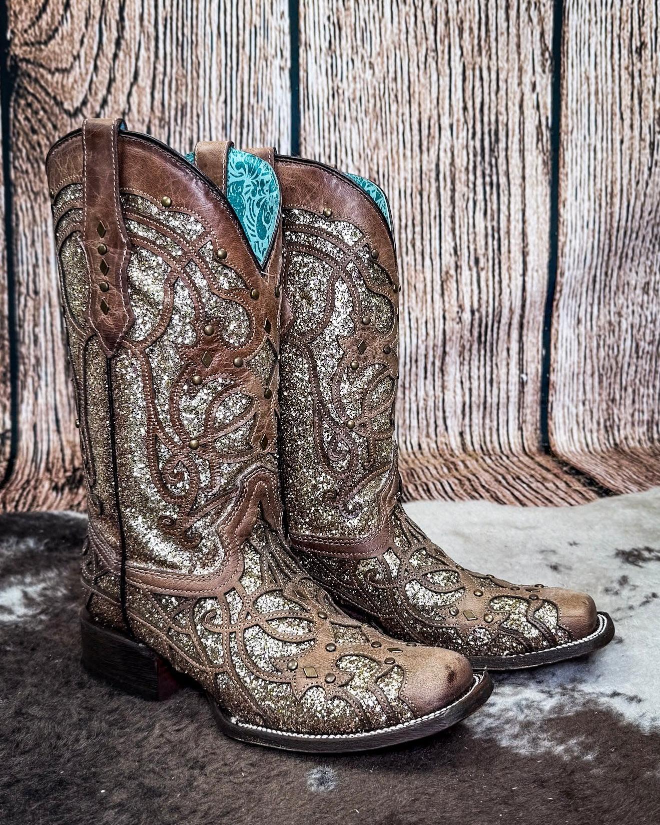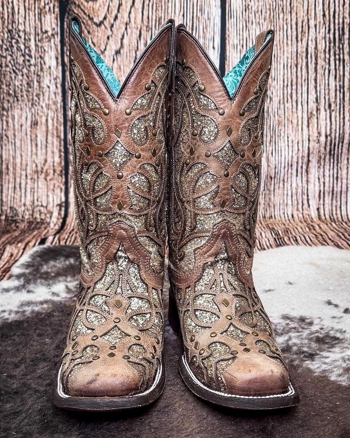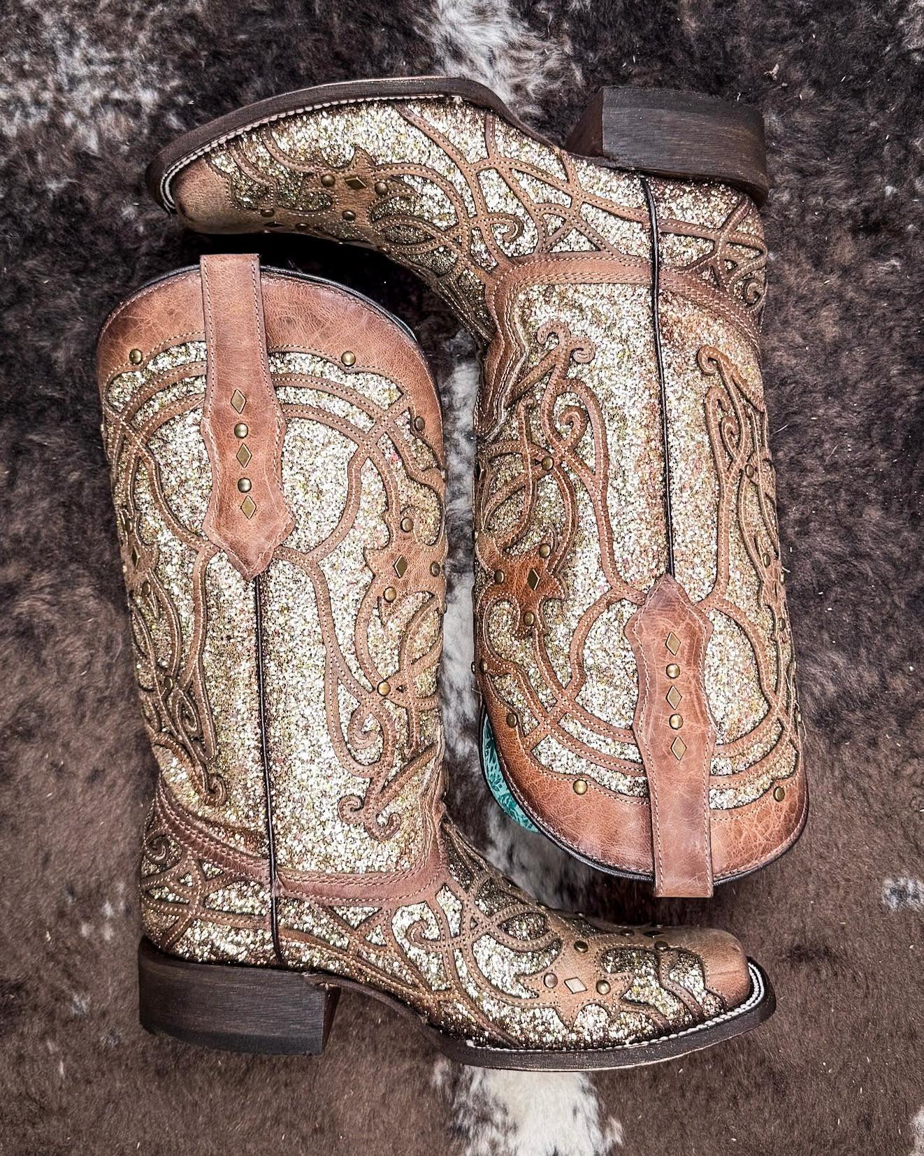The Golden Hour Corral Boot isn’t just a showpiece—it’s a statement. It's for the woman who blends grit and glam with ease. The one who walks confidently into a room, boots clicking, head high. It’s bold, but wearable. Flashy, but still grounded in quality and comfort.