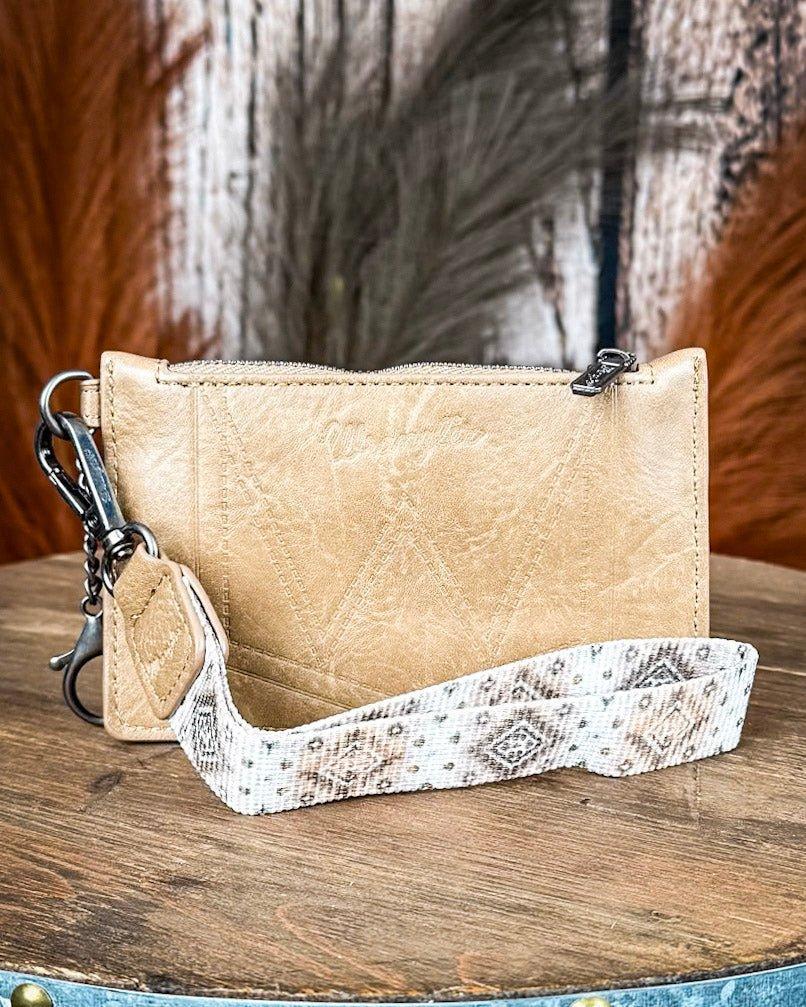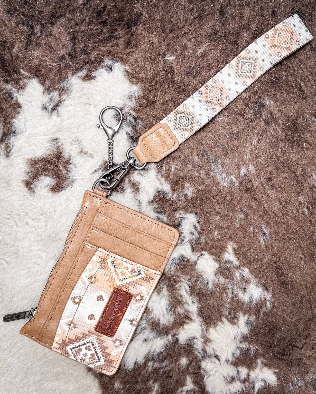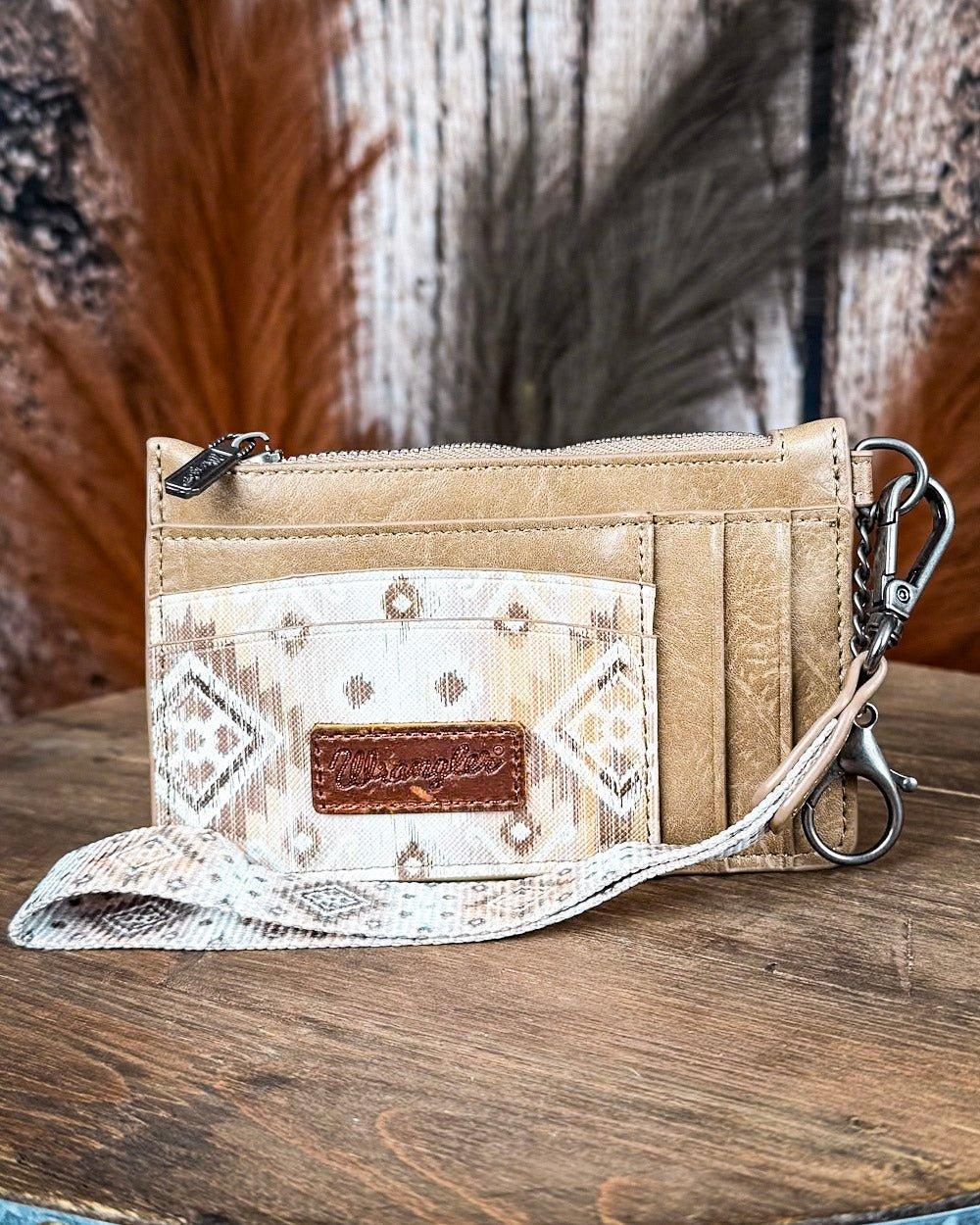 Channel desert-inspired style with the Savannah Aztec Card Holder in Khaki by Wrangler. Blending warm tan tones with a subtle southwestern Aztec pattern, this piece captures that rustic-chic Wrangler charm. Designed for both beauty and practicality, it features multiple card slots, a secure zipper pocket, and a detachable wristlet strap for effortless carry — whether you’re on the go or out on the town.