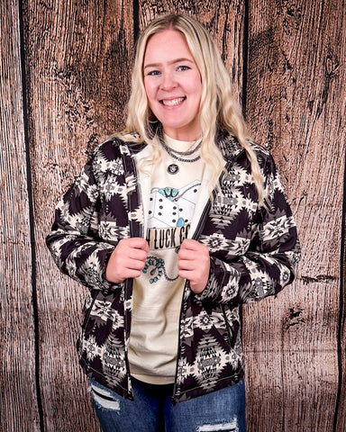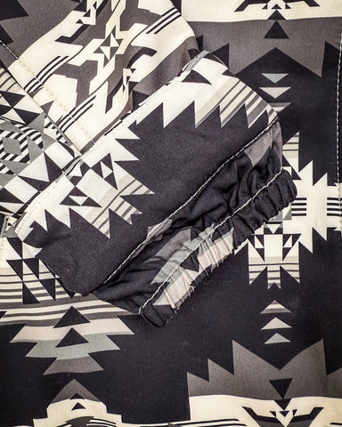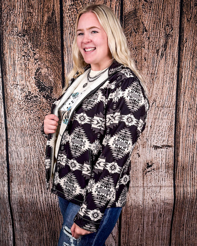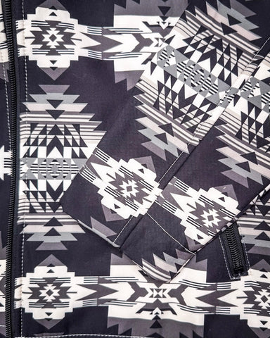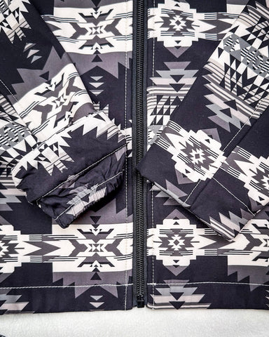 The exterior features a sleek black shell, accented with a cream and gray Aztec pattern that gives the jacket its signature look. It’s a design that feels artistic yet versatile, perfect for everyday wear, city outings, or western-inspired looks with a modern twist.