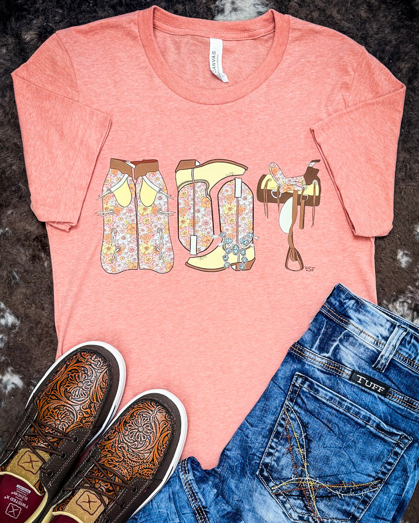 The graphic uses classic western essentials: boots, a hat, and a saddle, all decked out in a blooming, boho-inspired floral print. Each illustrated piece is full of vintage charm and soft pastel detail, giving this tee a fresh yet nostalgic feel. It’s playful, artistic, and full of personality—just like the women who wear it.
