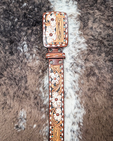 Where rugged meets refined, the Bluff and Bloom Leather Belt blends classic western charm with thoughtful artistry. Every detail is rooted in craftsmanship—from the rich hand-tooled floral pattern to the subtle burnished edges that speak of heritage and intention.