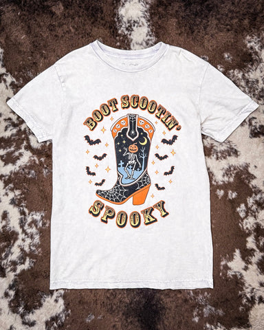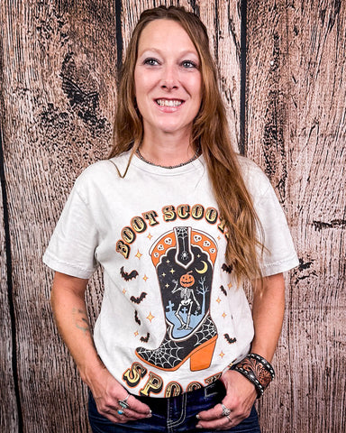 Meet your new favorite tee for pumpkin patches, bonfires, and two-steppin’ under the full moon. The Boot Scootin Spooky Tee brings all the Halloween vibes with a western twist—featuring a bold boot graphic filled with a dancing skeleton/jack-o’-lantern, spiderwebs, and bats. It’s festive without being too cheesy—and that's just how we like it.