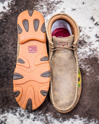 Meet your new favorite everyday staple with a little extra sunshine—the Bramble Chukka Driving Moc from Twisted X. This ankle-high classic blends rustic charm and unexpected beauty, with soft bomber leather and bright sunflower embroidery that feels equal parts wild and warm. It’s a statement piece that doesn’t shout—just shows up with style, comfort, and a whole lot of heart.