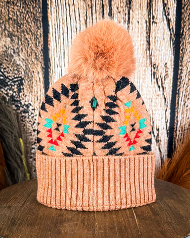 Cozy meets colorful in the Desert Sand Aztec Pom Beanie by C.C.