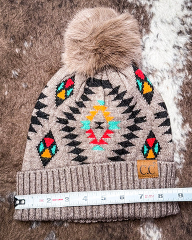 Neutral never looked so good. The Taupe Aztec Pom Beanie by C.C. is the perfect mix of cozy and colorful.