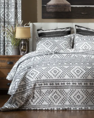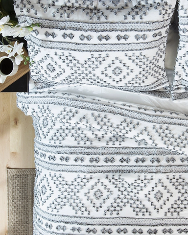 Inspired by the slow beauty of a hygge-inspired home, Ceniza layers in warmth without overwhelming your space. The pattern is subtle but striking—an intricate diamond motif in shades of soft black and grey across a creamy white base. It’s the kind of neutral that plays well with anything, but still brings its own personality. Whether your space leans rustic, modern, or somewhere in between, this comforter adds just the right amount of visual interest.