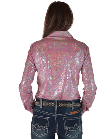 All the shine, none of the fuss. The Pink Party Chrome Pullover is everything you love about the original—now in a soft pink shade with an iridescent chrome glow that catches the light just right. It’s feminine, flattering, and built with serious function in mind. Whether you're stepping into the arena or heading out for the night, this top brings the sparkle without holding you back.
