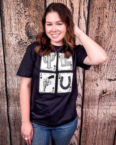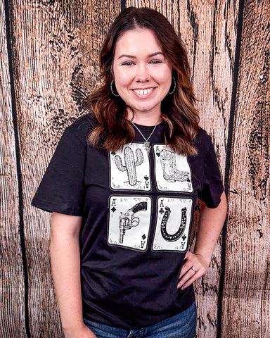 A little sass, a little western edge, and a whole lotta attitude—the Four Aces Graphic Tee is here to make a statement. This bold black tee brings together iconic western symbols with a playful twist that says exactly what you're thinkin’... without sayin’ a word.