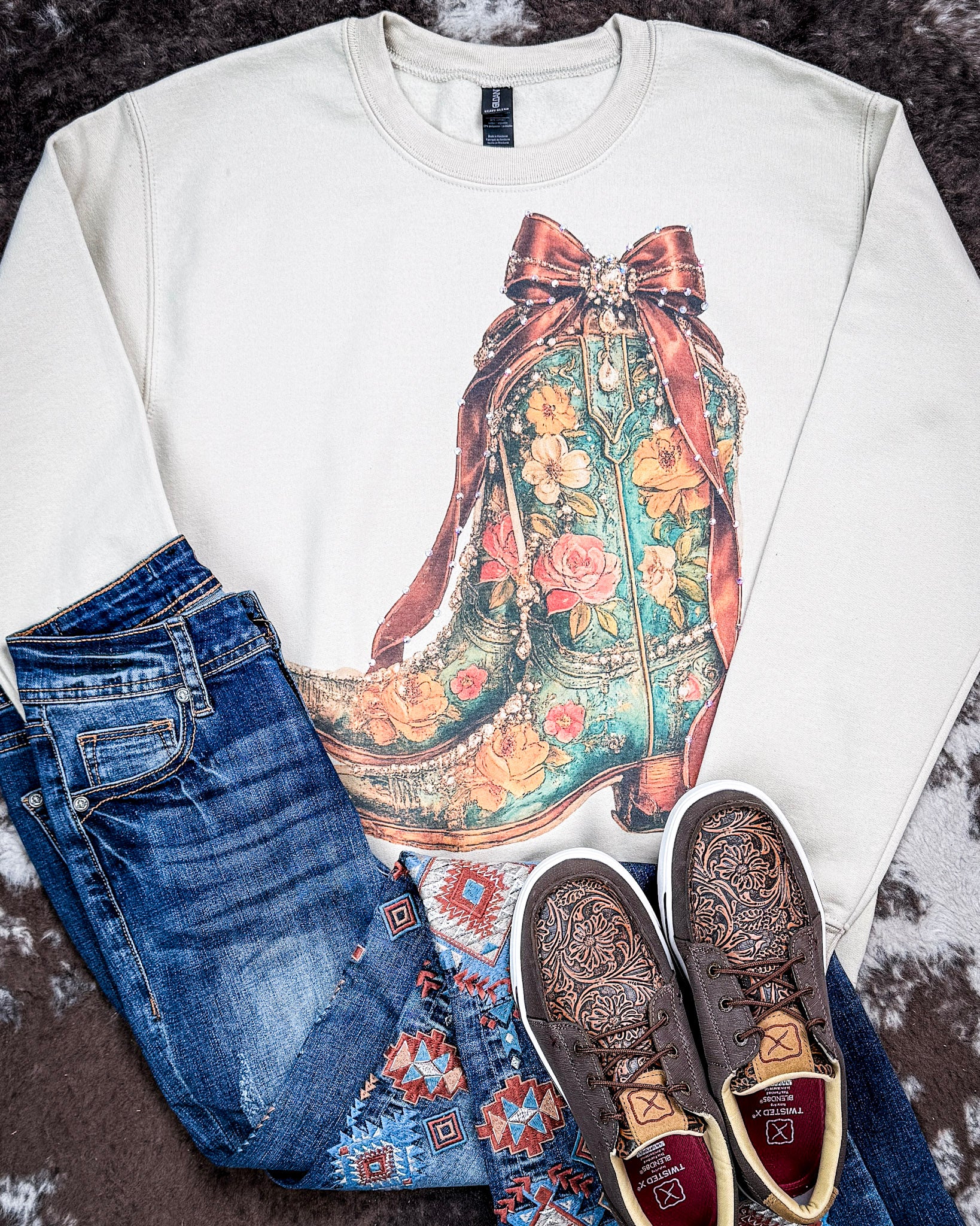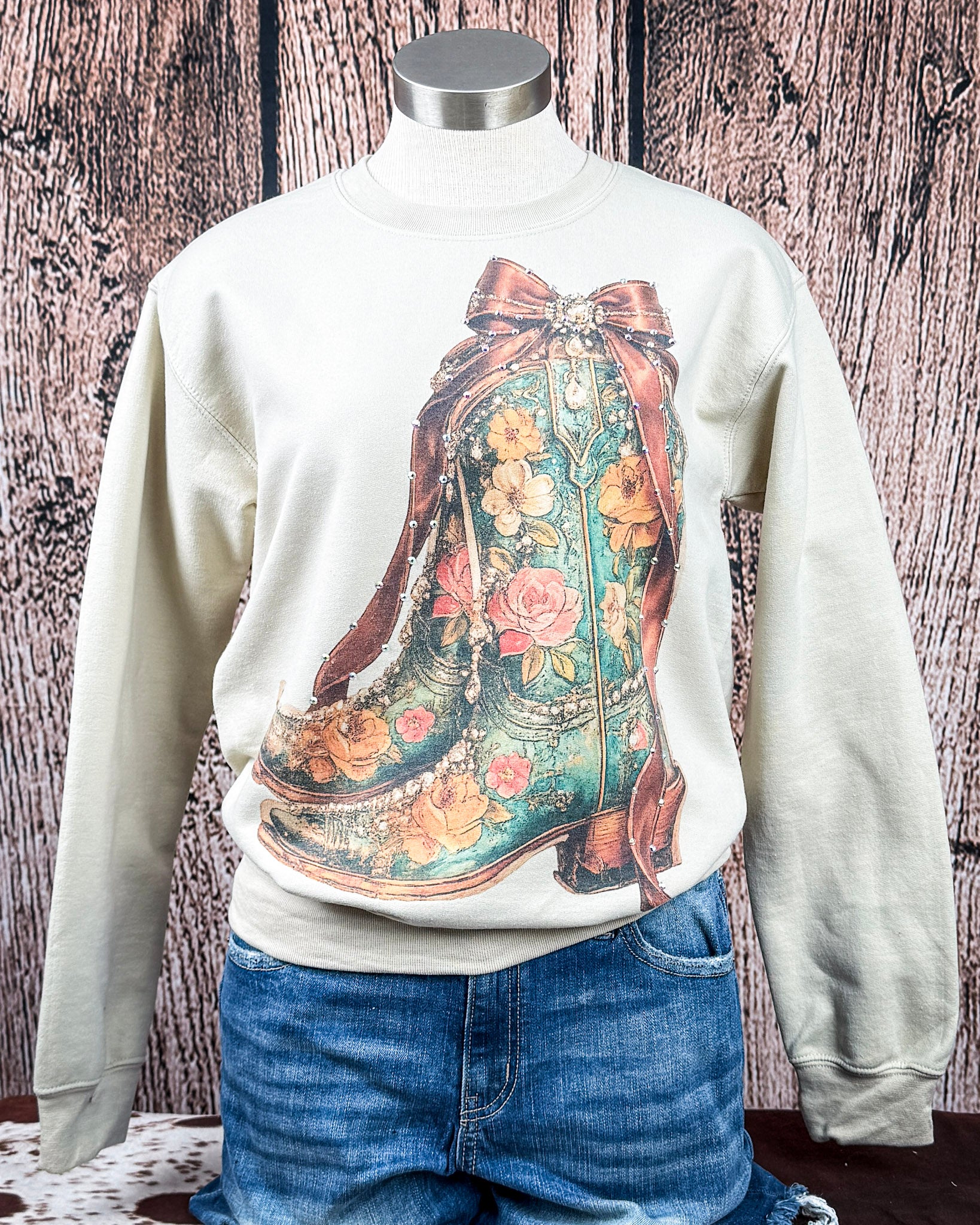 This floral cowboy boot sweatshirt blends romantic western detail with an elevated boutique feel. Designed on a warm tan base, the statement graphic features a richly detailed vintage inspired cowboy boot adorned with painterly florals in golden yellow, coral, and soft ivory tones. A dramatic satin bow crowns the boot, adding a refined, feminine finish to the artwork.