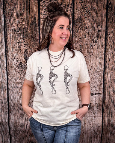 The muted cream-colored tee gives off that natural, sun-faded charm, making it easy to style year-round. Tuck it into your favorite jeans with boots for a dressed-down rodeo look, or knot it up with cutoffs for summer fair nights. Add a concho belt and some turquoise and you're instantly leveled up.