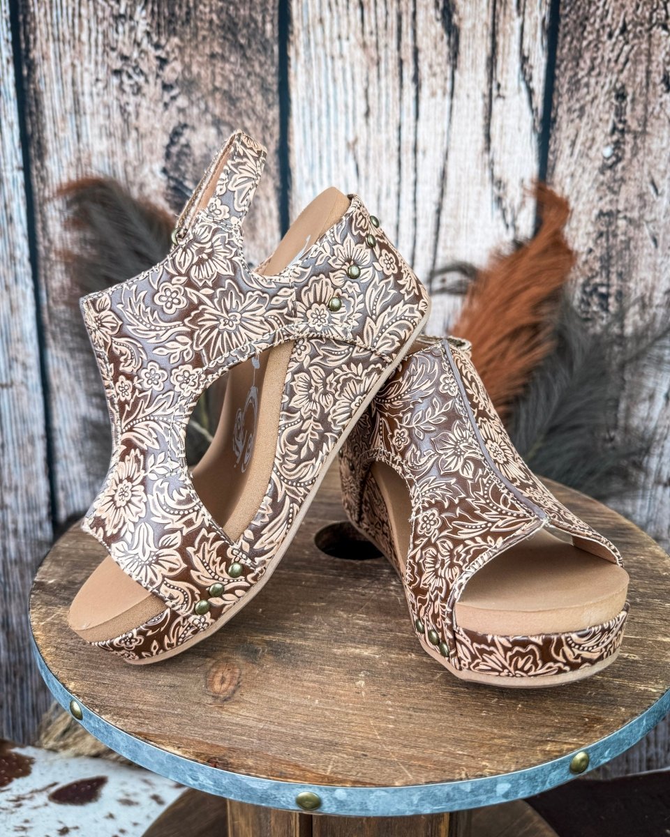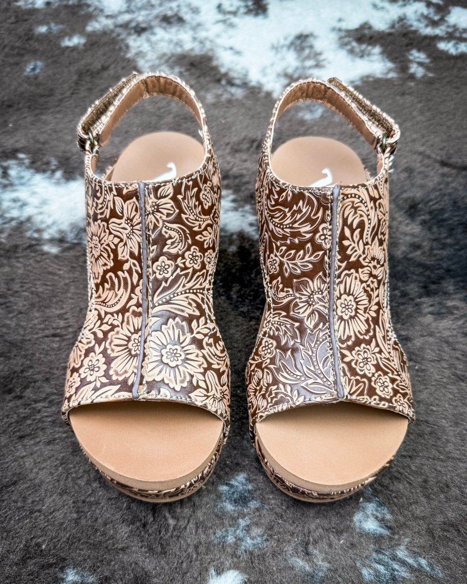 The Isabella Tooled Wedge in Tan by Very G blends classic western detailing with an elevated, everyday silhouette. Designed with an intricately tooled upper, this wedge features a rich tan tone with floral-inspired embossing that adds texture and standout style without being over the top.