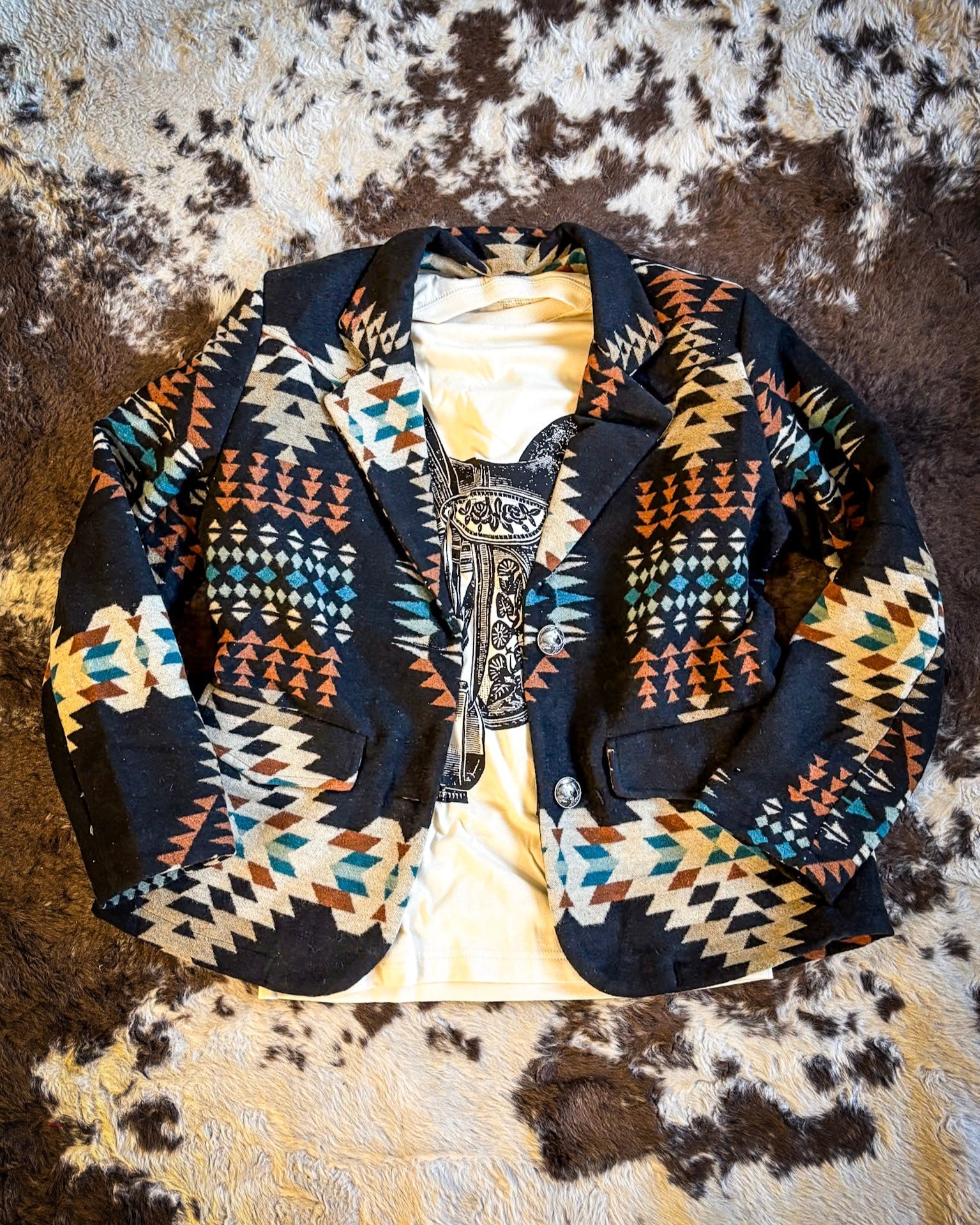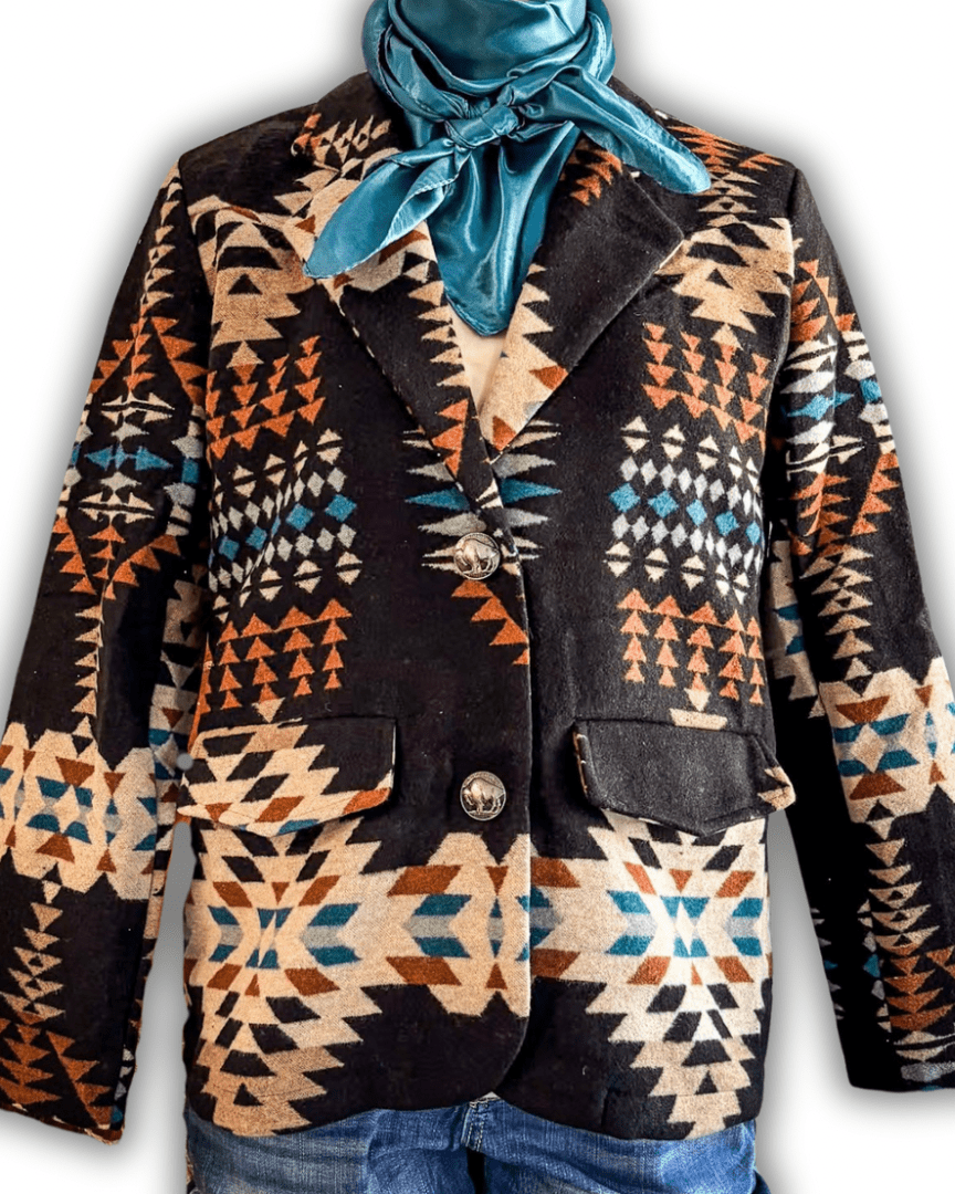 • Make an unforgettable statement with the Mesa Mirage Southwestern Print Blazer, a striking blend of bold style and classic tailoring. This piece captures the rugged elegance of the West while delivering a polished silhouette that works everywhere from the stockyards to city streets.