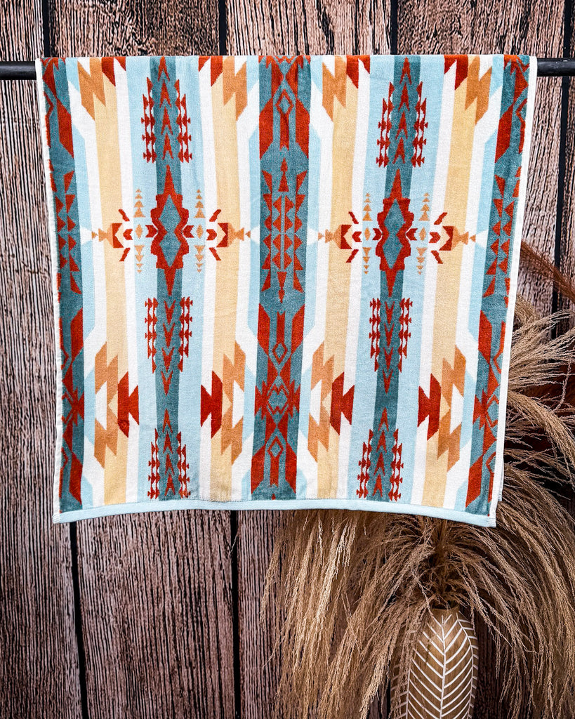 Woven from soft, absorbent cotton in a jacquard design, the Pecos Towels are more than just pretty—they're made to work. Each one features a double-sided, reversible pattern in a mix of rich desert tones and turquoise-inspired hues. Earthy tan, burnt orange, and dusty blue come together in a geometric, southwest-inspired motif that looks right at home in any western-style space.