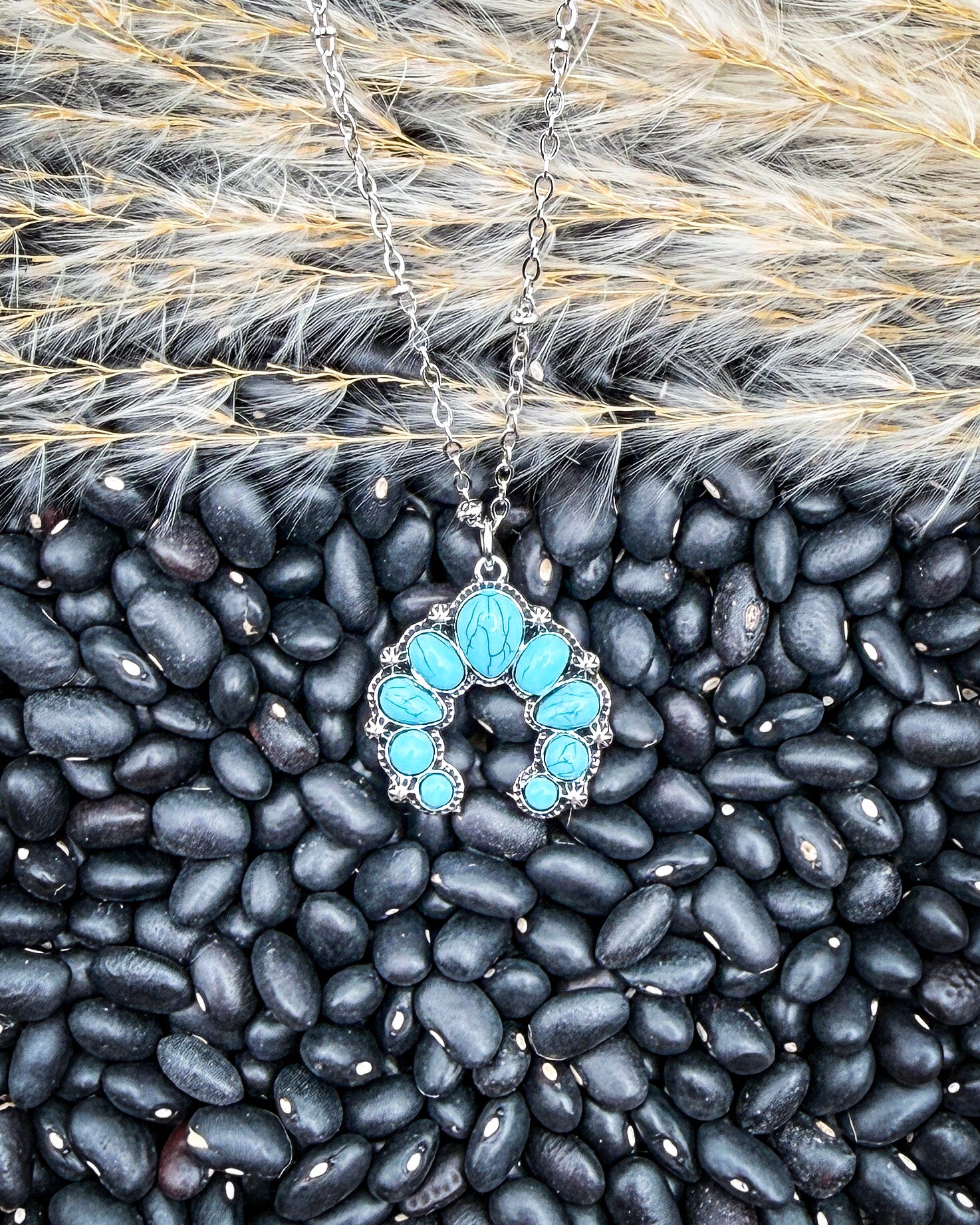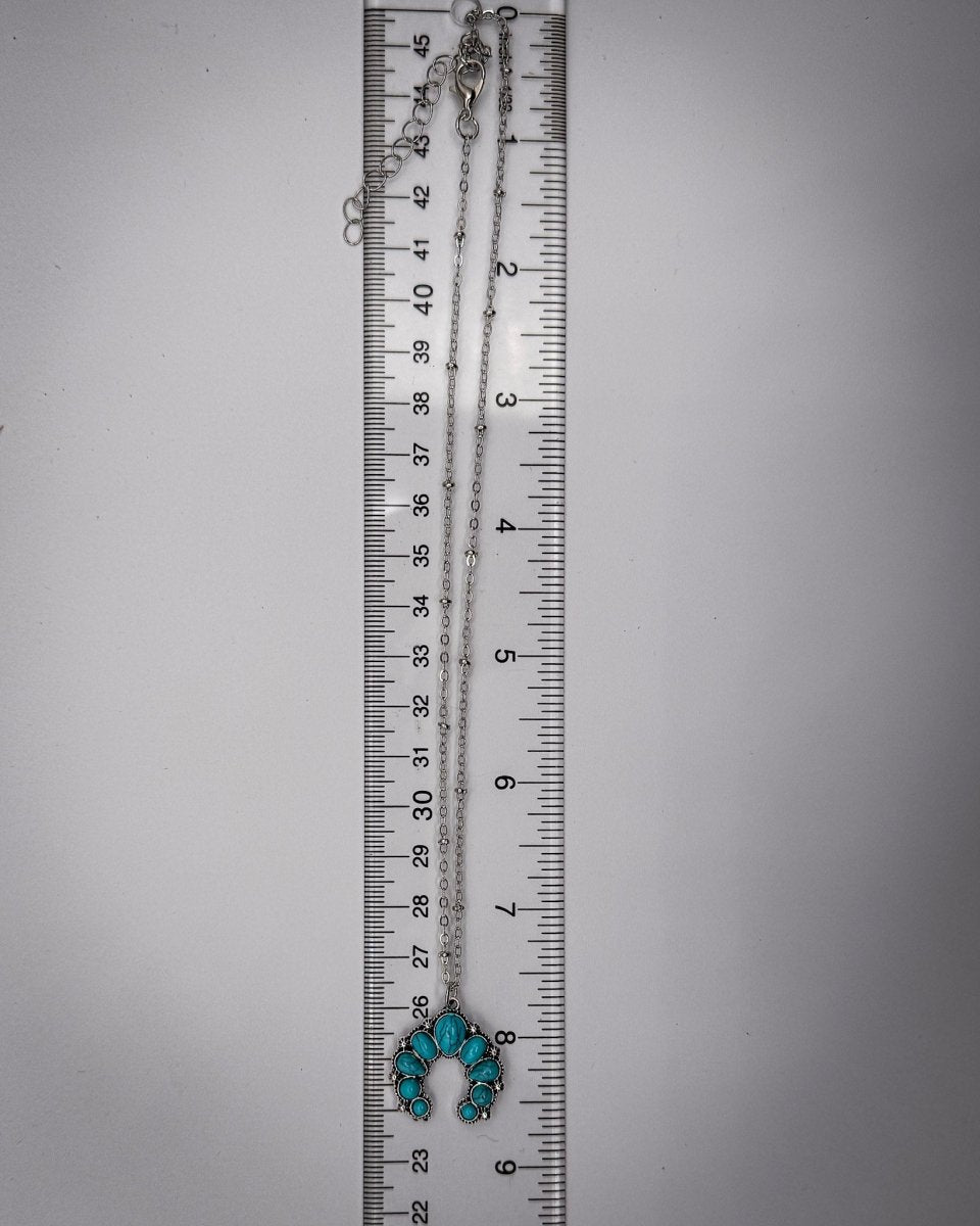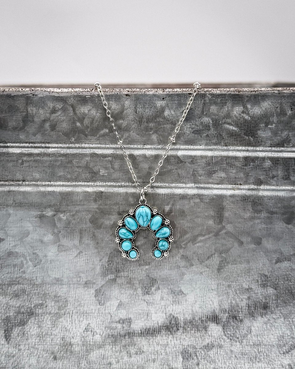 The Reina Squash Blossom Necklace brings a softer take on a western classic. Designed with a petite squash blossom–inspired pendant and faux turquoise stones, it delivers subtle statement energy in the prettiest way.