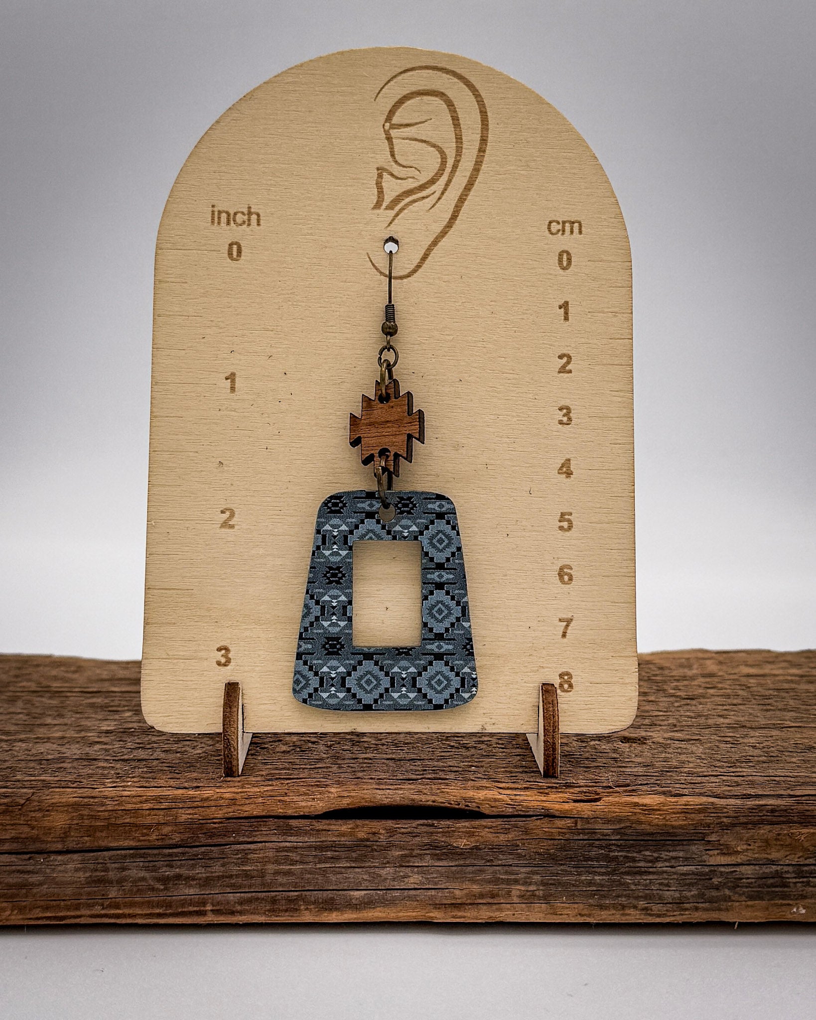 Topped with a carved wooden accent, this pair blends natural warmth with cool-toned patterning for a balanced boutique look. The structured shape feels polished and intentional, making these earrings easy to dress up or down. Pair them with denim and boots for everyday styling or add them to a monochrome outfit for a clean, statement finish. The antique bronze fishhook hardware complements the wood detail and enhances the western-inspired aesthetic.