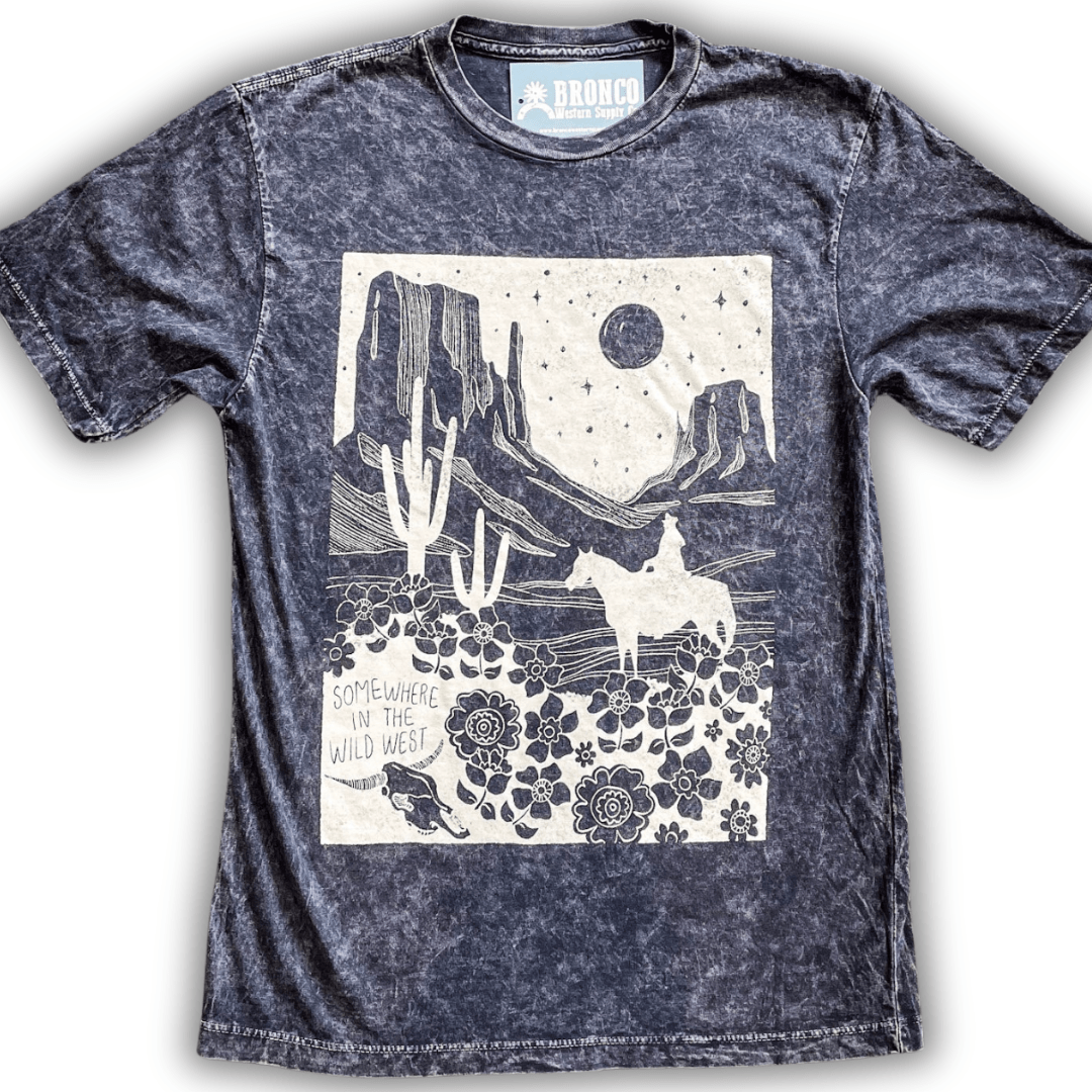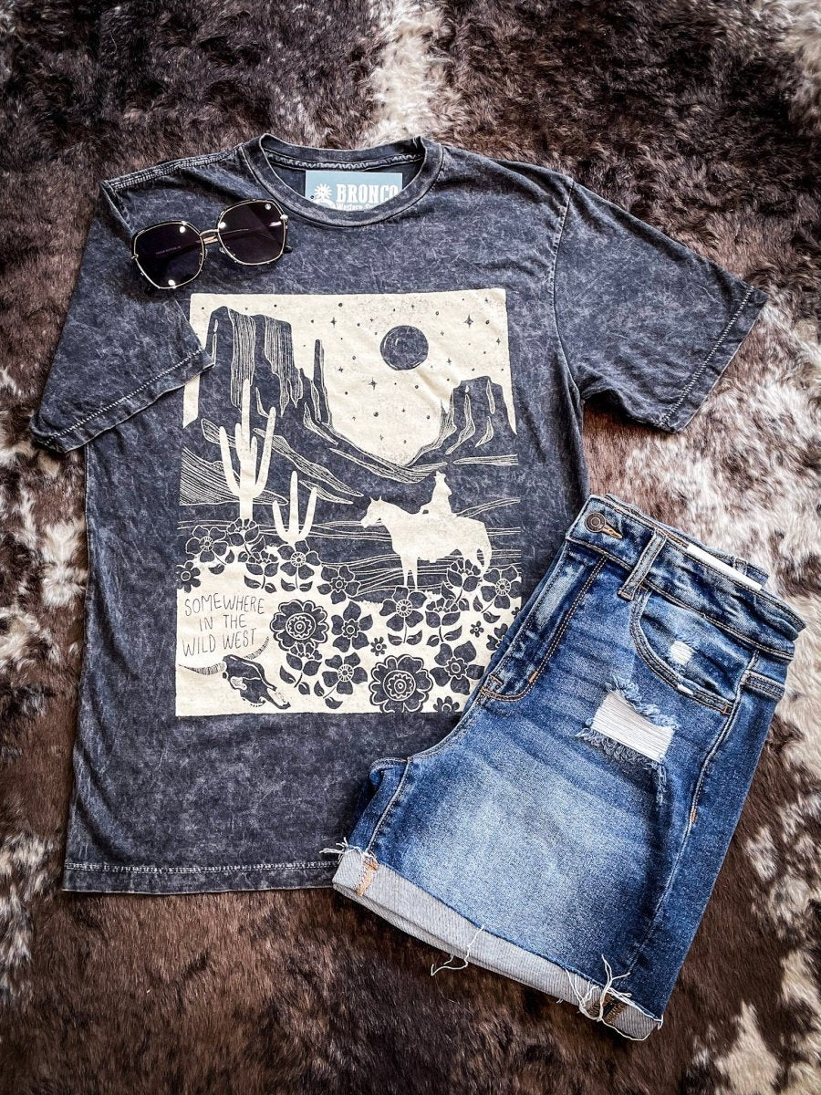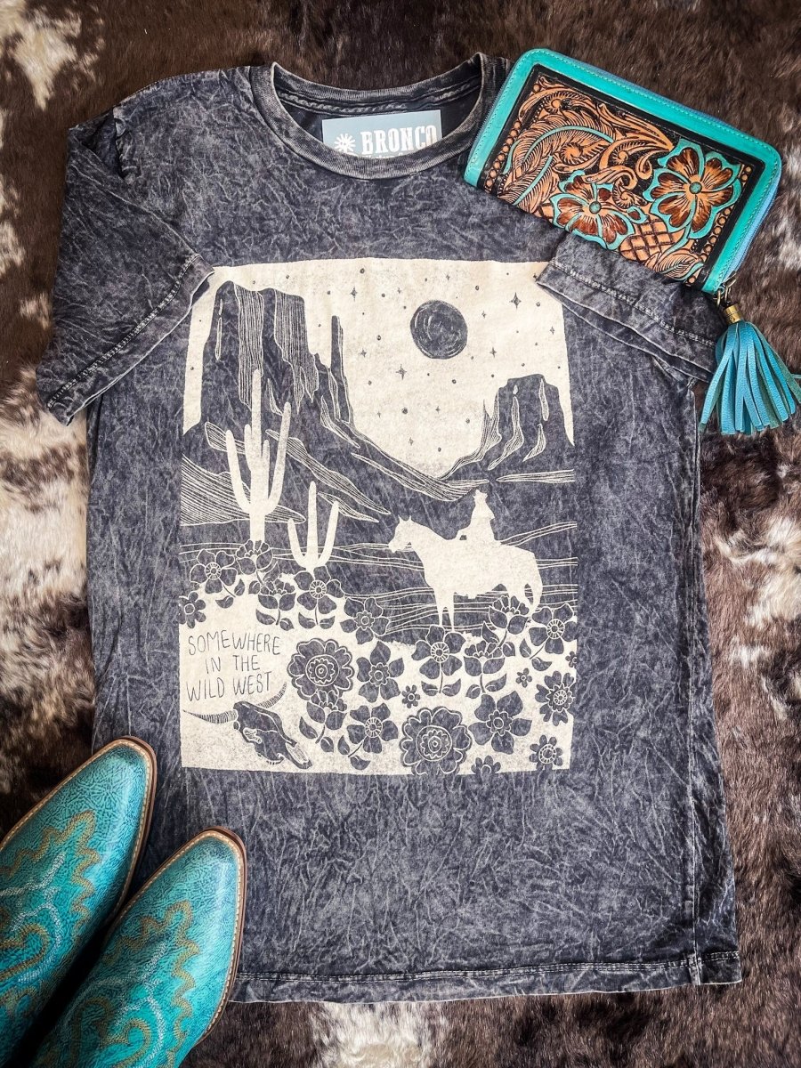 Embrace the untamed allure of the wild west with our Somewhere In The Wild West Graphic Tee - Black. Made from a mineral washed fabric, this loose-fitting and oh-so-comfortable Mineral Washed Boyfriend Tee is designed to make you feel relaxed while still looking effortlessly stylish. The open neckline and slightly dropped sleeves add a touch of casual chic to your everyday wardrobe. Featuring the iconic phrase "Somewhere In The Wild West" alongside a captivating cowgirl silhouette in a desert setting adorned with blooming flowers, this tee captures the essence of the West in a beautifully artistic way. Step into a world of Western charm with this standout piece from our Western boutique business.
