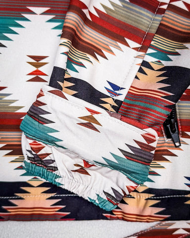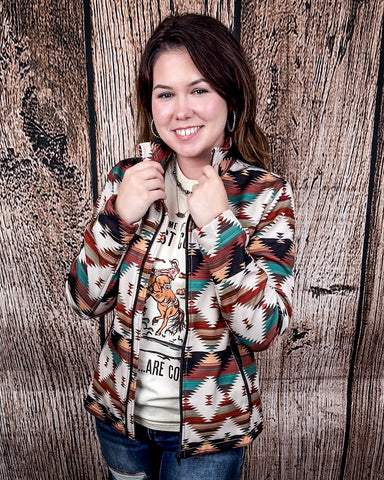 This jacket brings the perfect blend of cozy practicality and eye-catching design with its rich Aztec pattern in earthy fall tones like rust, turquoise, sand, and black. The geometric print makes it both timeless and distinctly western. Whether you’re spending the day in town, working the ranch, or traveling the open road, this piece adds just the right pop of personality to any outfit.