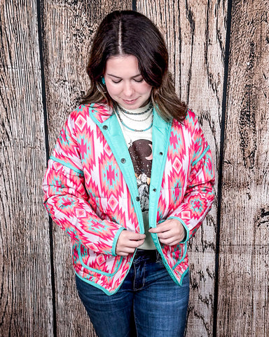 {"id":7391870746722,"title":"The Brynella Aztec Jacket","handle":"the-brynella-aztec-jacket","description":"\u003cp data-end=\"483\" data-start=\"174\"\u003eIf your wardrobe’s been craving a little color and a whole lot of personality, \u003cem data-end=\"274\" data-start=\"253\"\u003eThe Brynella Jacket\u003c\/em\u003e is here to answer the call. This jacket isn’t about blending in—it’s about showing up. With its punchy palette and playful energy, it’s the kind of piece that takes a simple outfit and turns it into a moment.\u003c\/p\u003e\n\u003cp data-end=\"863\" data-start=\"485\"\u003eDesigned with a bold Aztec-inspired print in shades of pink, orange, and turquoise, the Brynella is full of southwestern flair with a modern twist. The pattern feels electric but still rooted, like something you’d spot at golden hour on a wide-open horizon. And that pop of turquoise trim? It’s the perfect frame—bright, clean, and just unexpected enough to make you look twice.\u003c\/p\u003e\n\u003cp data-end=\"1229\" data-start=\"865\"\u003eBut for all its color and personality, this jacket’s also practical. The quilted body adds just the right amount of warmth, making it perfect for cool mornings, breezy nights, or whenever you want to layer without feeling bulky. Snap buttons down the front keep it easy and casual, and the pockets are right where you need them—roomy, sturdy, and trimmed to match.\u003c\/p\u003e\n\u003cp data-end=\"1665\" data-start=\"1231\"\u003eThe Brynella is made to move with you. It’s lightweight and breathable, with enough structure to hold its shape but soft enough to keep things comfortable. Whether you're pairing it with jeans and boots or throwing it over a dress for a night out, it holds its own without taking over the whole look. It’s one of those pieces that looks just as good with messy hair and a tee as it does with turquoise jewelry and your go-to lipstick.\u003c\/p\u003e\n\u003cp data-end=\"2017\" data-start=\"1667\"\u003eIt’s playful, it’s confident, and it doesn’t take itself too seriously. The Brynella was made for those days when you want to wear something that makes you feel alive—bright, bold, and a little bit unexpected. If your closet’s full of basics and neutrals, this is the perfect way to shake things up without stepping too far outside your comfort zone.\u003c\/p\u003e\n\u003cp data-end=\"2031\" data-start=\"2019\"\u003e\u003cspan style=\"color: rgb(250, 64, 156);\"\u003e\u003cstrong data-end=\"2031\" data-start=\"2019\"\u003eDetails:\u003c\/strong\u003e\u003c\/span\u003e\u003c\/p\u003e\n\u003cul data-end=\"2304\" data-start=\"2032\"\u003e\n\u003cli data-end=\"2073\" data-start=\"2032\"\u003e\n\u003cp data-end=\"2073\" data-start=\"2034\"\u003eQuilted jacket with snap-button front\u003c\/p\u003e\n\u003c\/li\u003e\n\u003cli data-end=\"2126\" data-start=\"2074\"\u003e\n\u003cp data-end=\"2126\" data-start=\"2076\"\u003ePink, orange, and turquoise Aztec-inspired print\u003c\/p\u003e\n\u003c\/li\u003e\n\u003cli data-end=\"2171\" data-start=\"2127\"\u003e\n\u003cp data-end=\"2171\" data-start=\"2129\"\u003eTurquoise trim adds a bold, clean finish\u003c\/p\u003e\n\u003c\/li\u003e\n\u003cli data-end=\"2212\" data-start=\"2172\"\u003e\n\u003cp data-end=\"2212\" data-start=\"2174\"\u003eLightweight with a relaxed, easy fit\u003c\/p\u003e\n\u003c\/li\u003e\n\u003cli data-end=\"2257\" data-start=\"2213\"\u003e\n\u003cp data-end=\"2257\" data-start=\"2215\"\u003eFunctional side pockets with trim detail\u003c\/p\u003e\n\u003c\/li\u003e\n\u003cli data-end=\"2304\" data-start=\"2258\"\u003e\n\u003cp data-end=\"2304\" data-start=\"2260\"\u003eGreat for layering in transitional weather\u003c\/p\u003e\n\u003c\/li\u003e\n\u003c\/ul\u003e\n\u003cp data-end=\"2633\" data-start=\"2306\"\u003eThe Brynella Jacket isn’t shy—and that’s exactly the point. It’s for the days when your outfit needs a little spark, when you want to feel wrapped up in something that’s both fun and functional. Whether you're headed to the rodeo, the coffee shop, or just chasing a little color in your day, the Brynella’s ready to ride along.\u003c\/p\u003e\n\u003cul\u003e\n\u003cli\u003e\u003cspan\u003e100% Polyester\u003c\/span\u003e\u003c\/li\u003e\n\u003c\/ul\u003e\n\u003ctable style=\"width: 100%; height: 243.75px;\"\u003e\n\u003ctbody\u003e\n\u003ctr style=\"height: 30.1875px;\"\u003e\n\u003ctd style=\"width: 14.2599%; text-align: center; height: 30.1875px;\"\u003e\n\u003cp\u003e\u003cstrong\u003eSIZE \u003c\/strong\u003e\u003c\/p\u003e\n\u003c\/td\u003e\n\u003ctd style=\"width: 16.9675%; text-align: center; height: 30.1875px;\"\u003e\n\u003cp\u003e\u003cstrong\u003eCHEST\u003c\/strong\u003e\u003c\/p\u003e\n\u003c\/td\u003e\n\u003ctd style=\"width: 18.9531%; text-align: center; height: 30.1875px;\"\u003e\n\u003cp\u003e\u003cstrong\u003eLENGTH\u003c\/strong\u003e\u003c\/p\u003e\n\u003c\/td\u003e\n\u003ctd style=\"width: 15.1625%; text-align: center; height: 30.1875px;\"\u003e\n\u003cp\u003e\u003cstrong\u003eSLEEVE WIDTH\u003c\/strong\u003e\u003c\/p\u003e\n\u003c\/td\u003e\n\u003ctd style=\"width: 33.213%; text-align: center; height: 30.1875px;\"\u003e\n\u003cp\u003e\u003cstrong\u003eSLEEVE LENGTH\u003c\/strong\u003e\u003c\/p\u003e\n\u003c\/td\u003e\n\u003c\/tr\u003e\n\u003ctr style=\"height: 35.5938px;\"\u003e\n\u003ctd style=\"width: 14.2599%;\"\u003e\n\u003cp\u003e\u003cspan\u003eXS\u003c\/span\u003e\u003c\/p\u003e\n\u003c\/td\u003e\n\u003ctd style=\"width: 16.9675%;\"\u003e\n\u003cp\u003e\u003cspan\u003e22\"\u003c\/span\u003e\u003c\/p\u003e\n\u003c\/td\u003e\n\u003ctd style=\"width: 18.9531%;\"\u003e\n\u003cp\u003e\u003cspan\u003e25\"\u003c\/span\u003e\u003c\/p\u003e\n\u003c\/td\u003e\n\u003ctd style=\"width: 15.1625%;\"\u003e\n\u003cp\u003e\u003cspan\u003e8\"\u003c\/span\u003e\u003c\/p\u003e\n\u003c\/td\u003e\n\u003ctd style=\"width: 33.213%;\"\u003e\n\u003cp\u003e\u003cspan\u003e18.5\"\u003c\/span\u003e\u003c\/p\u003e\n\u003c\/td\u003e\n\u003c\/tr\u003