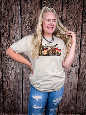 This one’s perfect for layering or letting it shine on its own. Tuck it into your favorite high-waisted denim, knot it over a flowy skirt, or wear it oversized with biker shorts for a casual day out. It’s the kind of tee that doesn’t just fit your style—it fits your lifestyle. And whether you're two-steppin’ in a small-town bar or grabbing coffee in the city, it’ll bring a little bit of western warmth with you wherever you go.