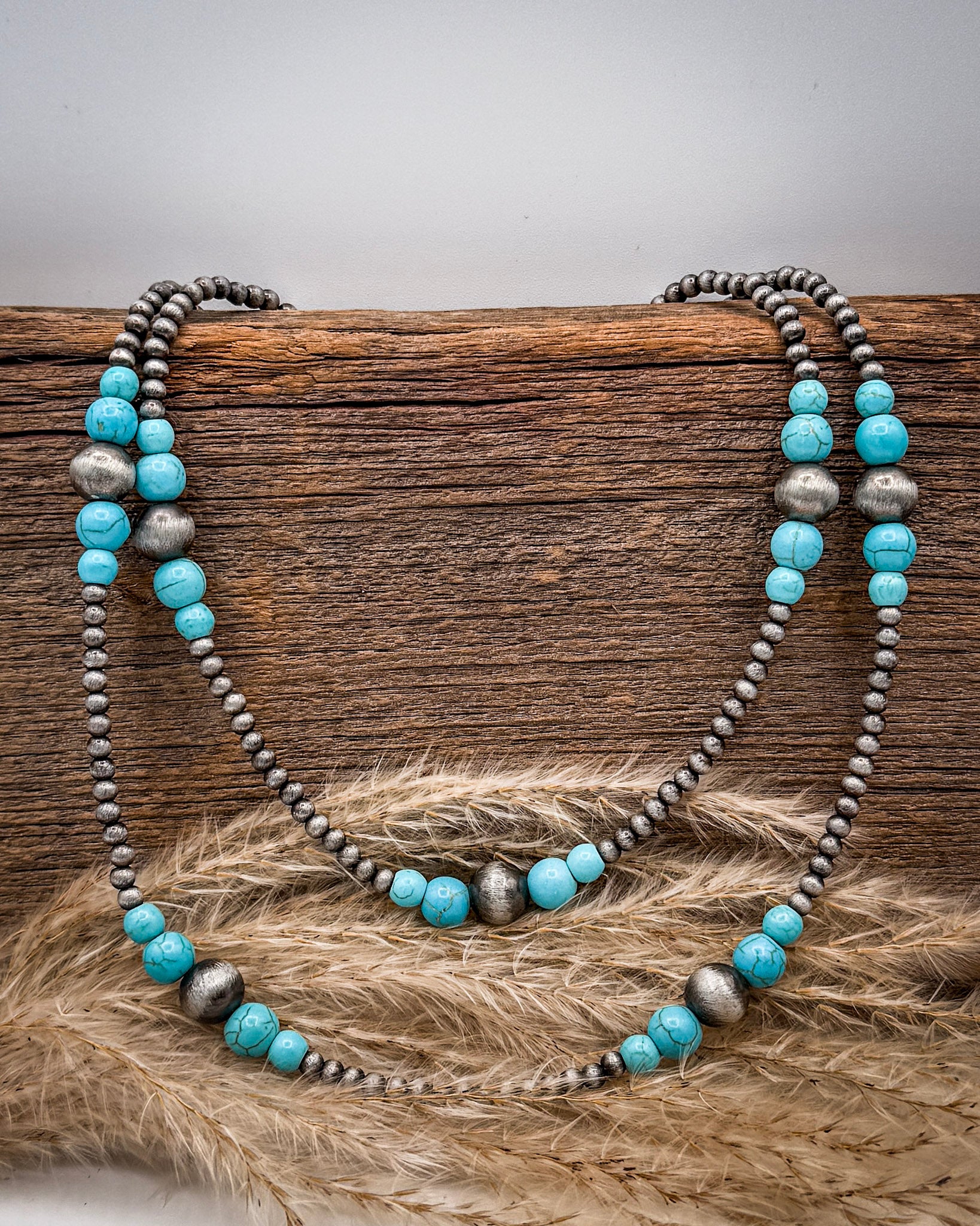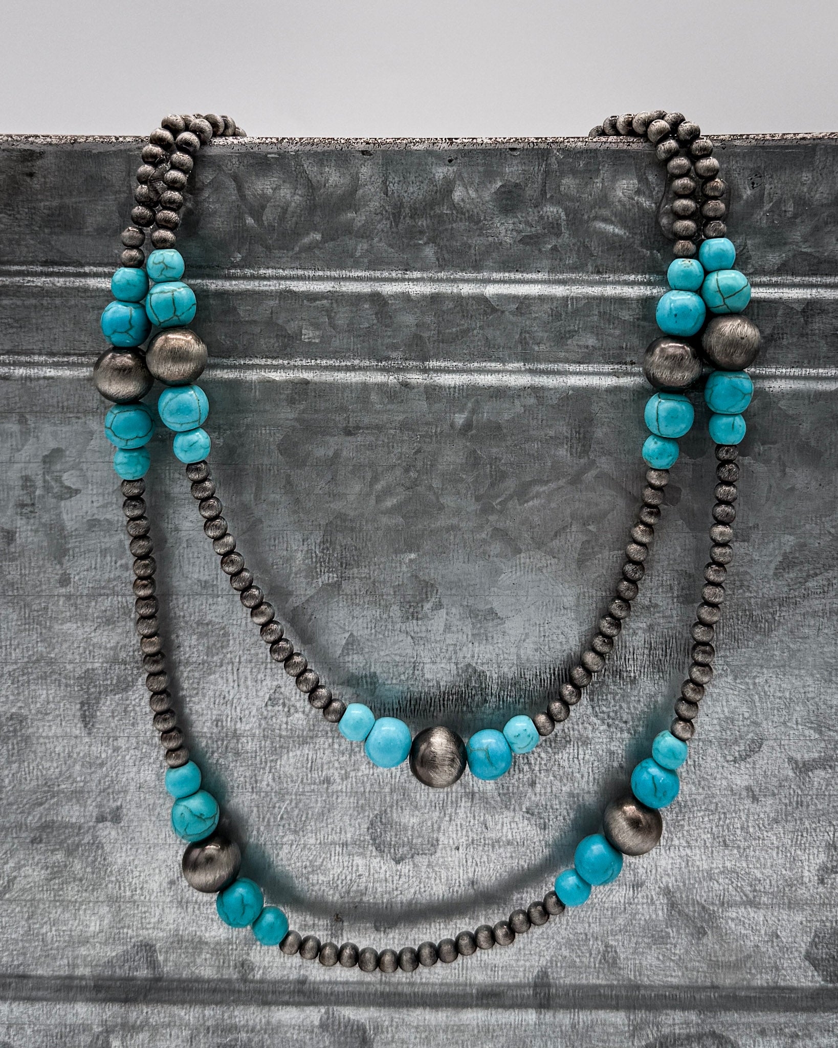 The Turnback Trail Layered Necklace was made for long days and wide-open spaces. This double strand design brings together silver-toned faux pearls and pops of faux turquoise beads for a look that feels equal parts ranch-ready and pulled together.
