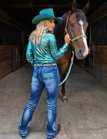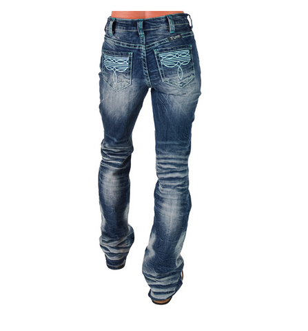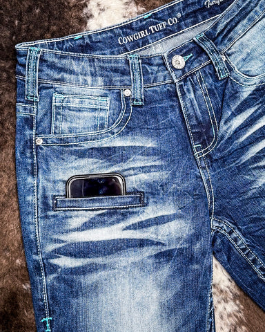 Bright, bold, and built to last, the Turquoise Boot Stitch Bootcut Jeans by Cowgirl Tuff are made for women who want a little extra flair with their function. These jeans take everything you love about a classic bootcut and add a fresh twist with standout details, durable construction, and that signature Cowgirl Tuff fit.