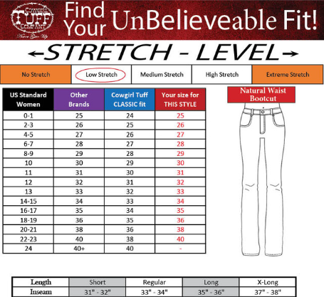 Fit Tip: Every Cowgirl Tuff style fits a little different—and that’s exactly why we include a specific size chart for each style right here on the page. Be sure to check it out before you add to your cart so you can snag the perfect fit the first time.