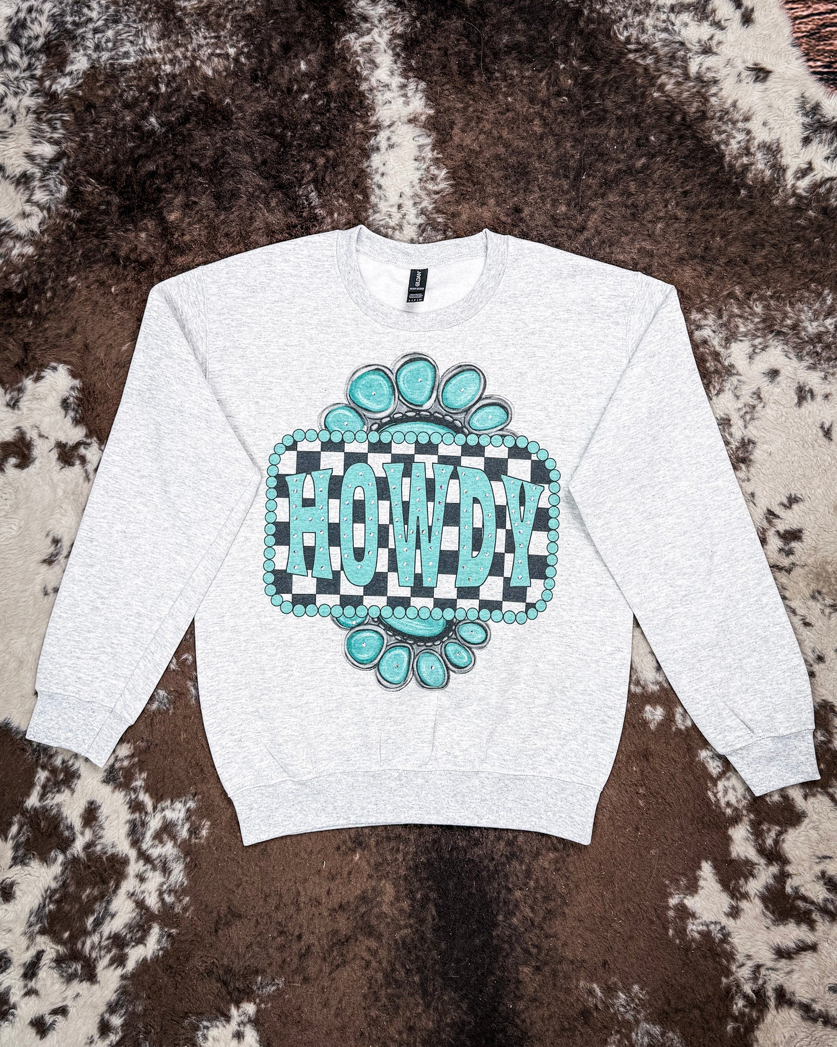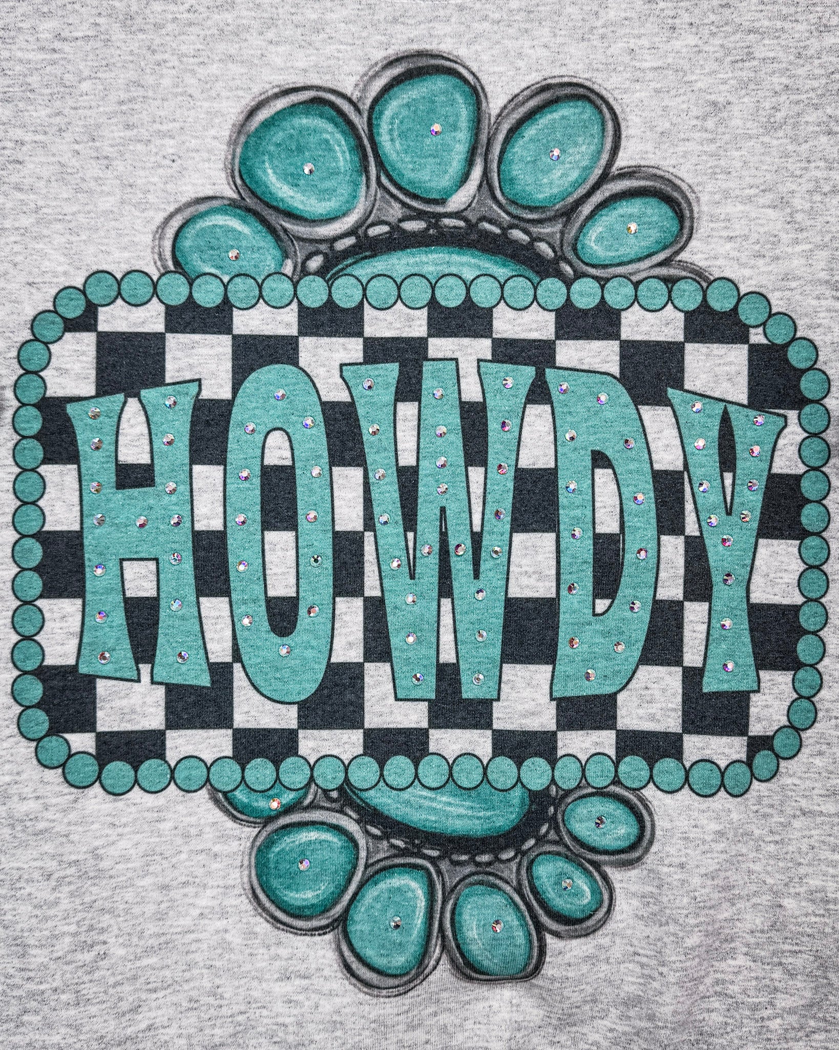• This turquoise Howdy sweatshirt brings bold western style and modern detail together in the best way. Set on a classic gray base, the graphic features vibrant turquoise lettering layered over a black and white checkered background, framed with a statement concho inspired design. Subtle rhinestone accents add a hint of shimmer that catches the light without overpowering the look.
