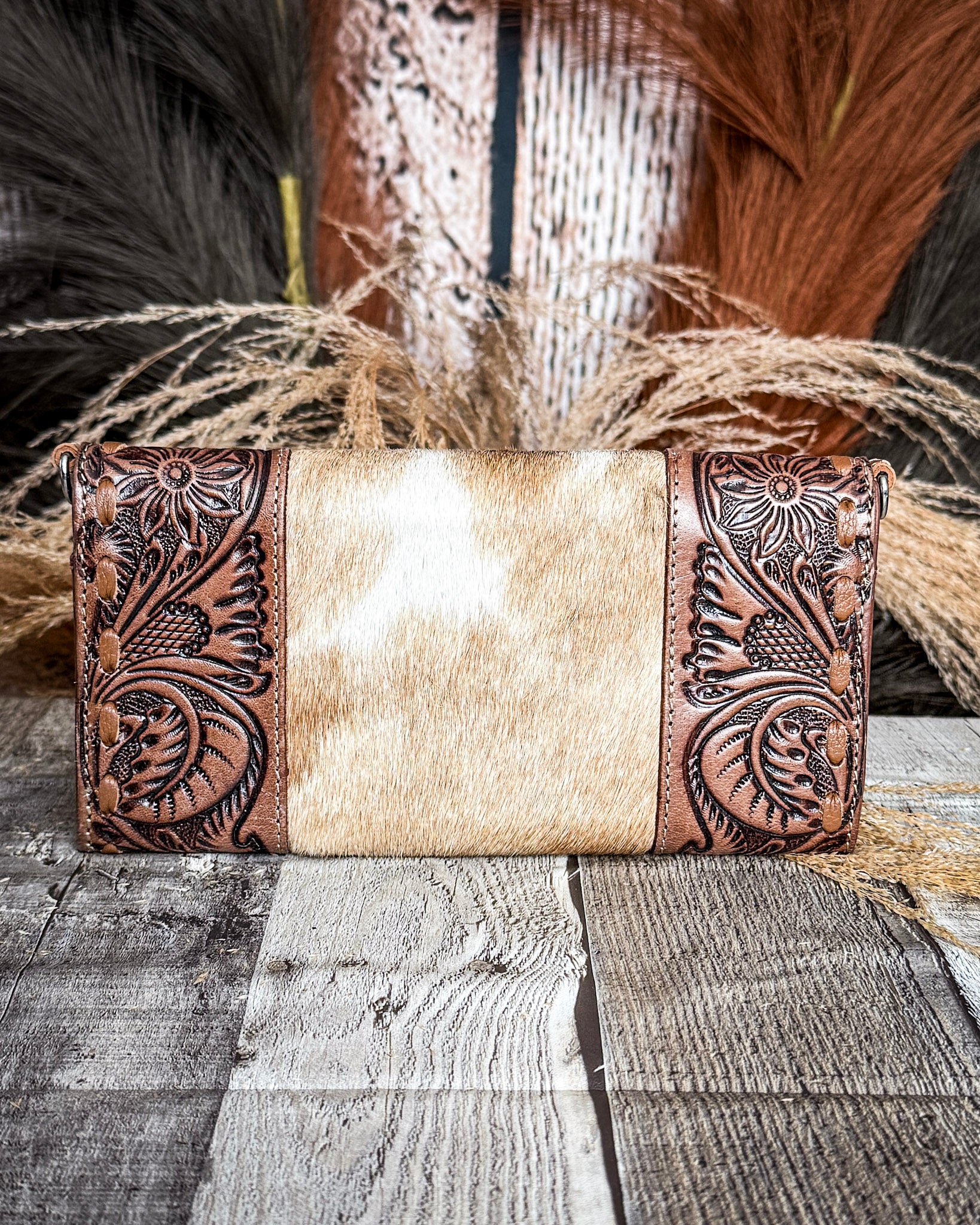 The hand-tooled leather brings that rich, detailed western feel, while the center panel of brown and white hair-on hide adds just the right touch of texture. It’s one of those pieces that feels thoughtful and elevated, even though it’s super easy to use day to day.