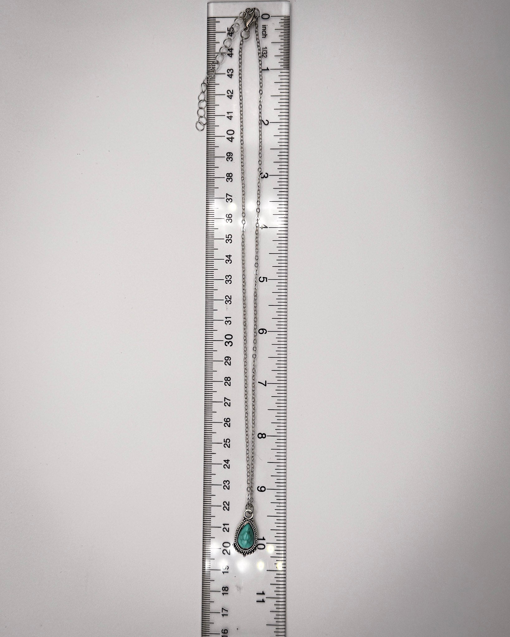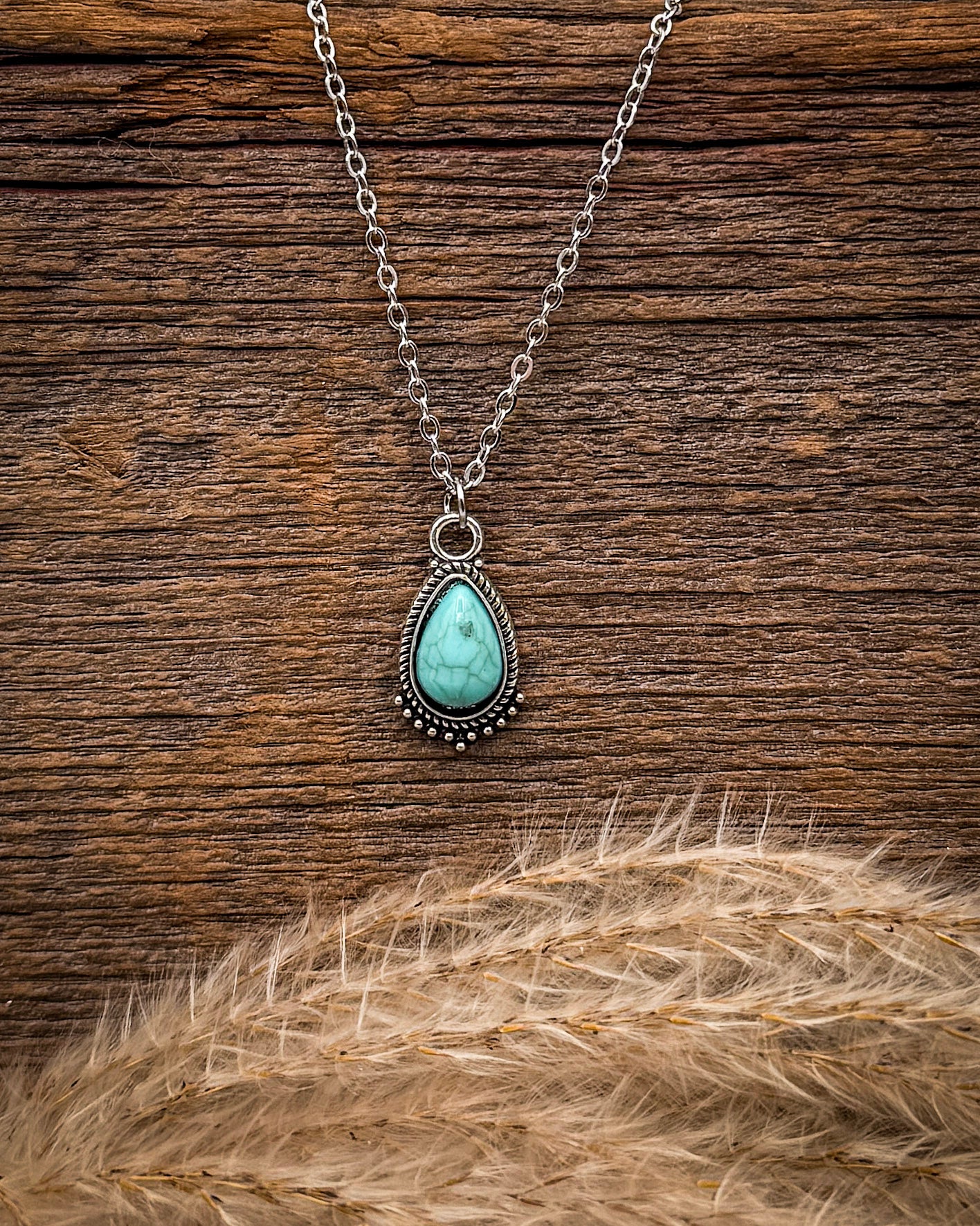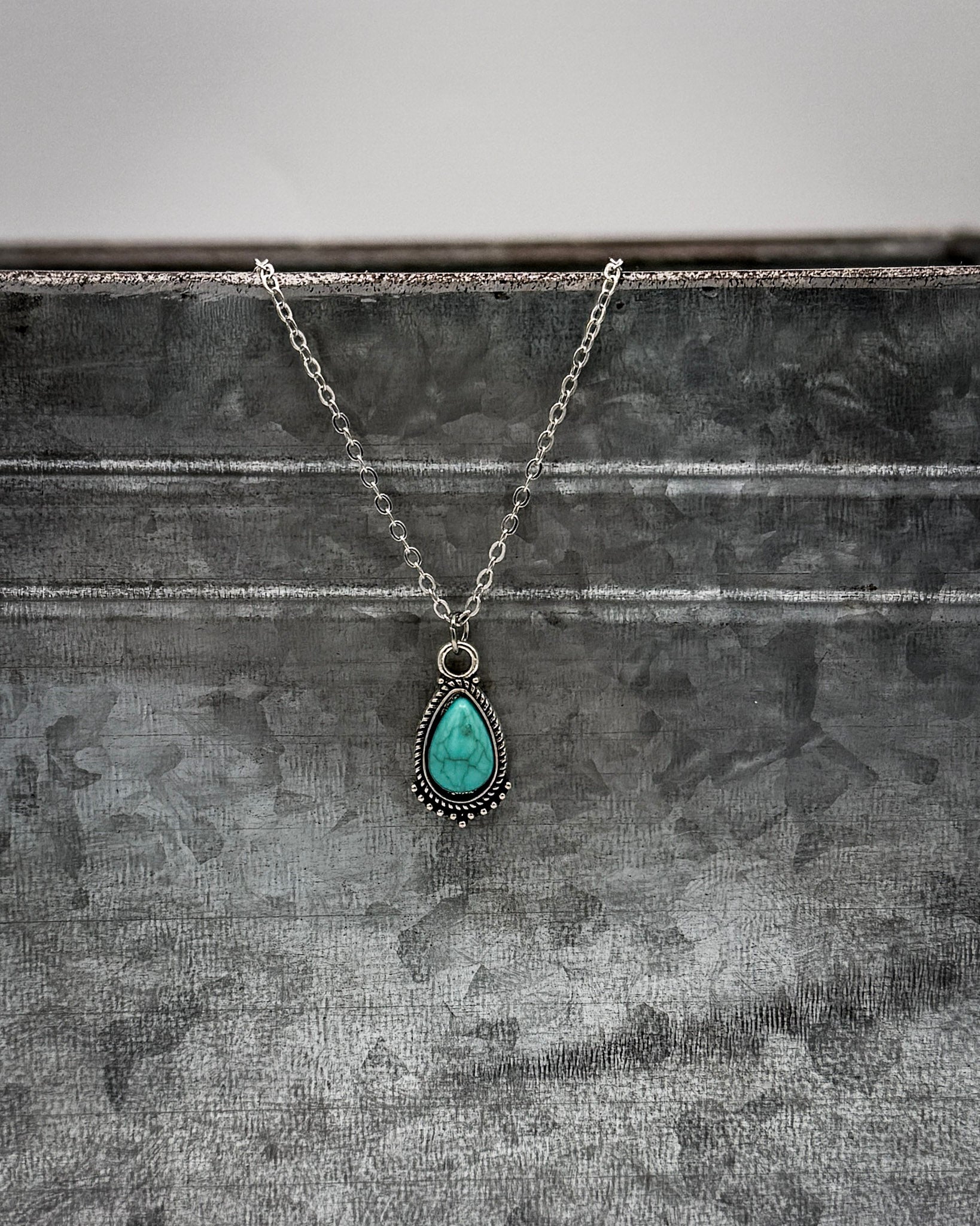 The Willow Teardrop Pendant Necklace is soft, simple, and effortlessly wearable. Featuring a delicate silver teardrop setting with a faux turquoise center stone, this piece adds just the right touch of western charm without feeling overdone.